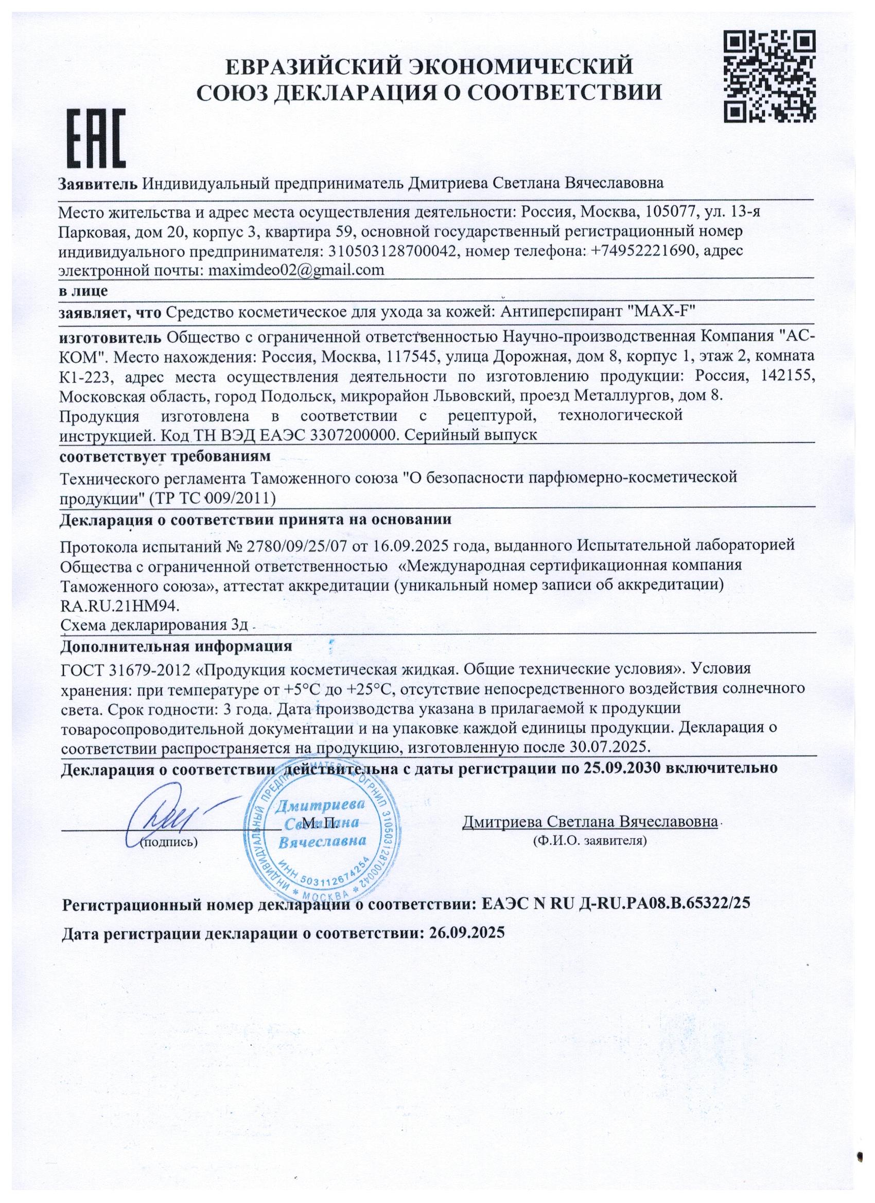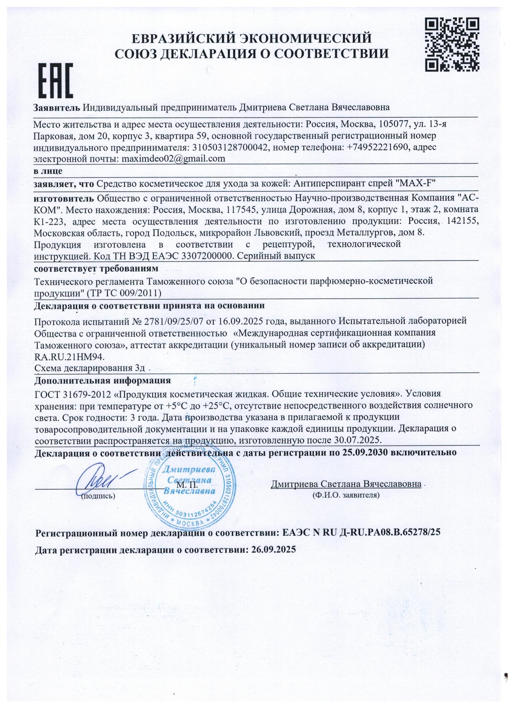 Декларация соответствия на Антиперспиранты спреи MAX-F.